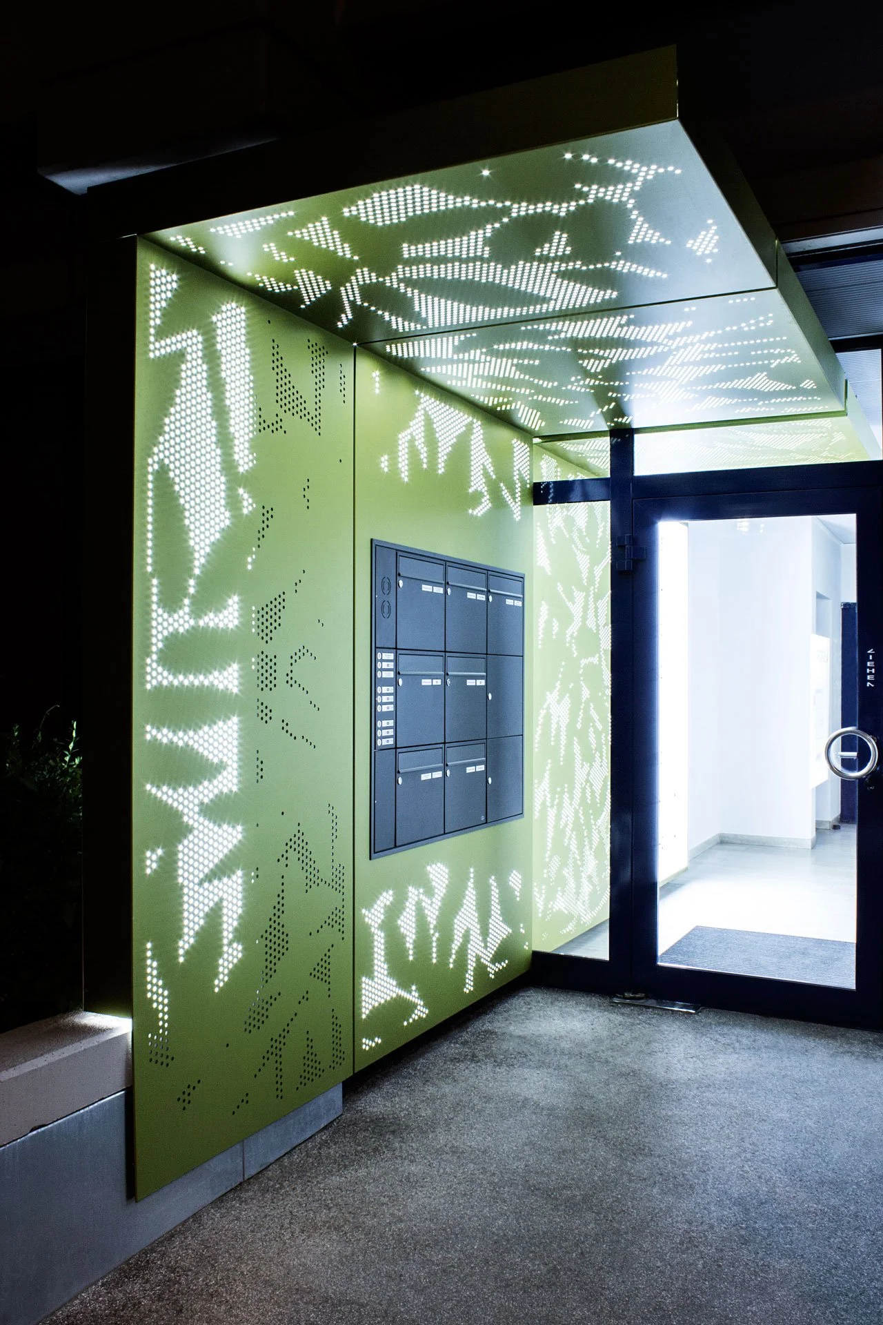 Die Idee war, das Äußere in das Innere des Gebäudes zu übertragen. Durch die grafisch reduzierten Blattstrukturen, die in grün eloxierte Alubleche eingearbeitet und hinterleuchtet wurden, entsteht ein eleganter und hochwertiger Eingangsbereich. Das Design verleiht dem Raum eine atmosphärische und stilvolle Atmosphäre, die den natürlichen Charakter des Außenbereichs auf moderne Weise zitiert.